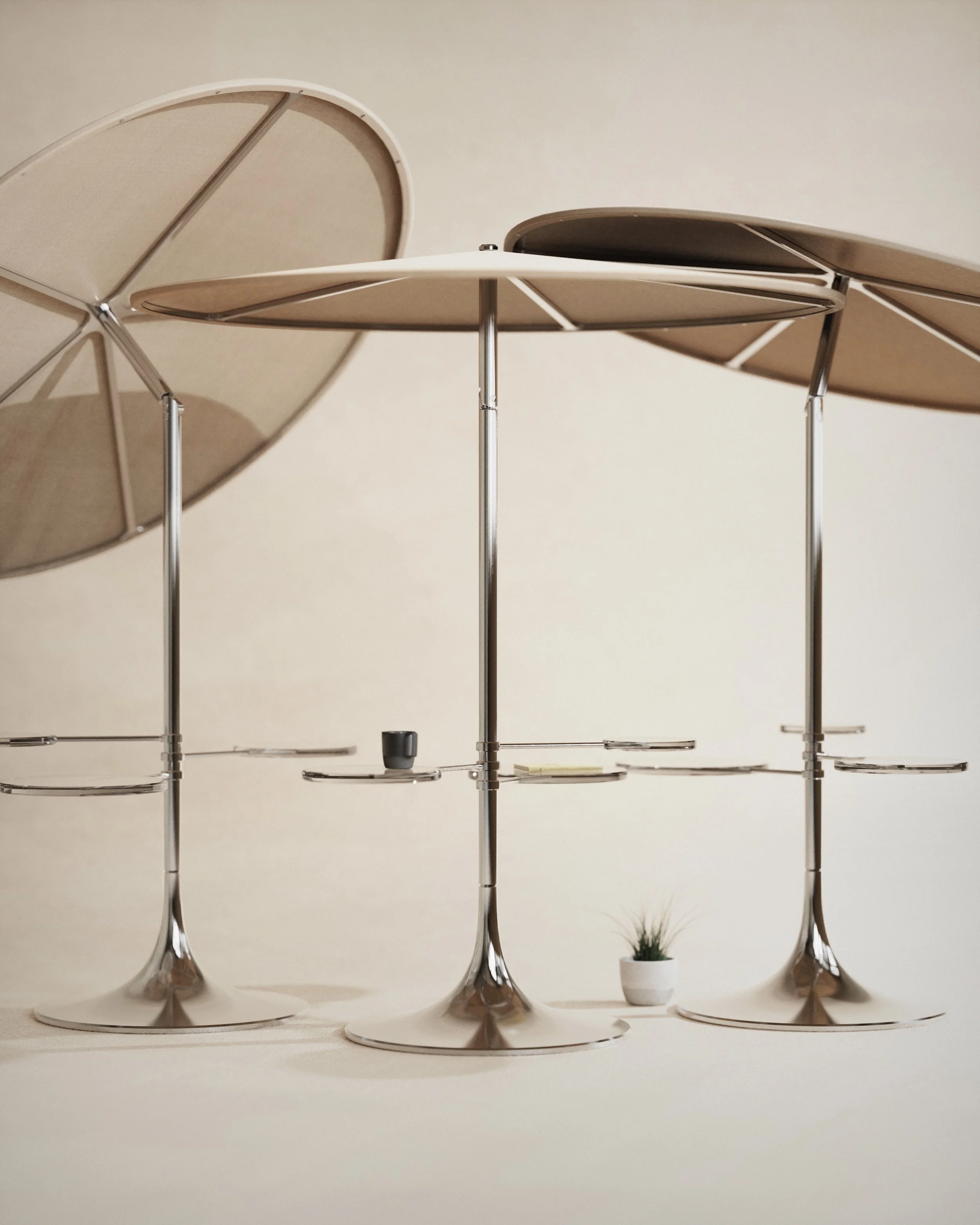 This sun shade has custom threaded attachments and a removable snapping canvas top, allowing for multiple types of tables and tops. Unsnapping the top also lets the design maintain its form even while it’s windy, so the skeleton of the umbrella can live on 4eva :)