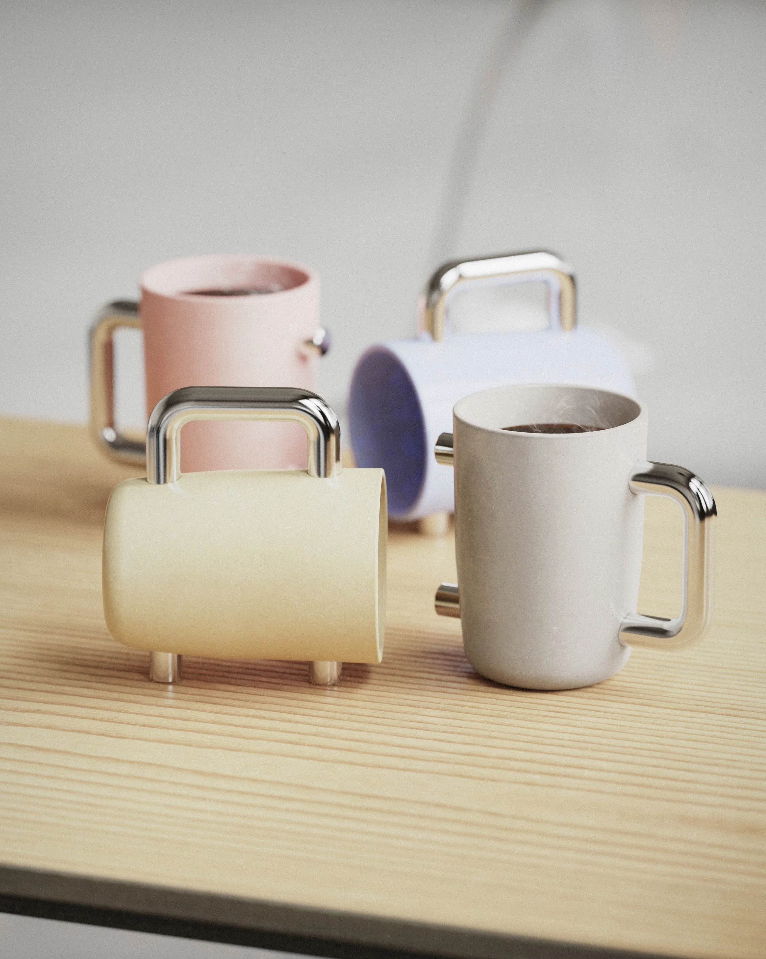 This mug was inspired by the landscaping and yard work I often did in my youth. While constructing planter boxes I would have to use a staple gun to secure mesh wiring around the box to keep gophers out; I always found the stapling to be very satisfying and loved how the staple looked partially sticking out of the wood. The Staple Mug juxtaposes an imperfect organic ceramic material with a highly precise machined metal handle that seems to pierce through the entire mug. When displayed on its side, the mug appears to be stapled into the table it rests on, inviting the user to display this mug as a sculptural piece of art that lives outside of the cabinet. With this unique product constantly being out in the open and ready to use, it easily becomes a staple item of your morning routine.