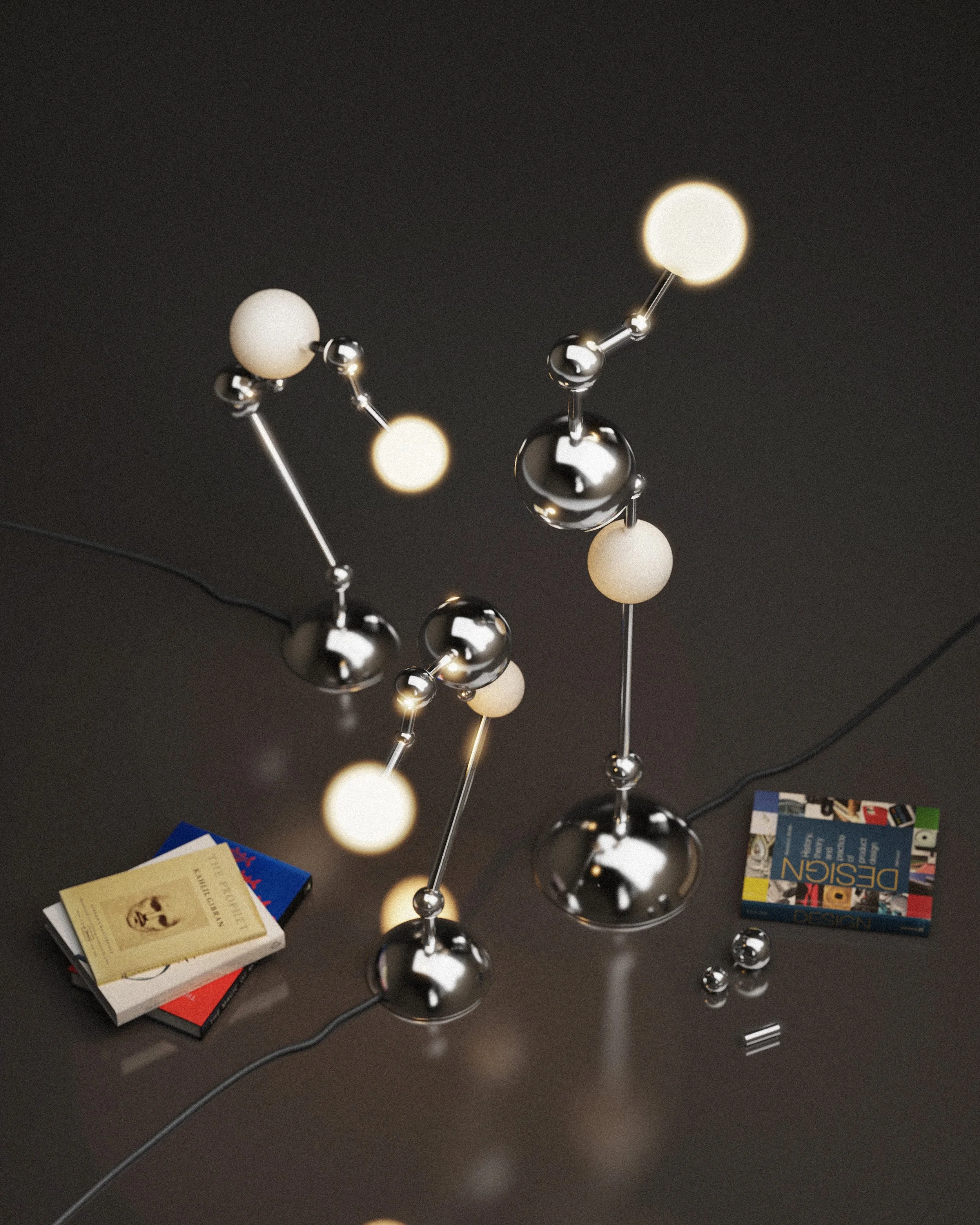 This Lamp was inspired by constellations in space. Designed with a modularity similar to an erector set, each lamp configuration is unique and parallels the interplanetary dance of the cosmos.